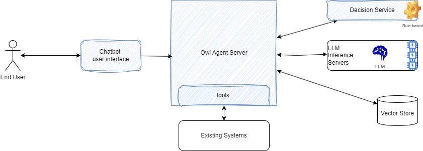A typical solution includes: 1/ a front end to let a human interact with the system, 2/ a backend to manage the life cycle of agents integrated with a LLM running as a service, with dynamic integration to tools and functions, vector store retrievers, and decision services. 3/ Decision service with inference rules to control the decision to be made.